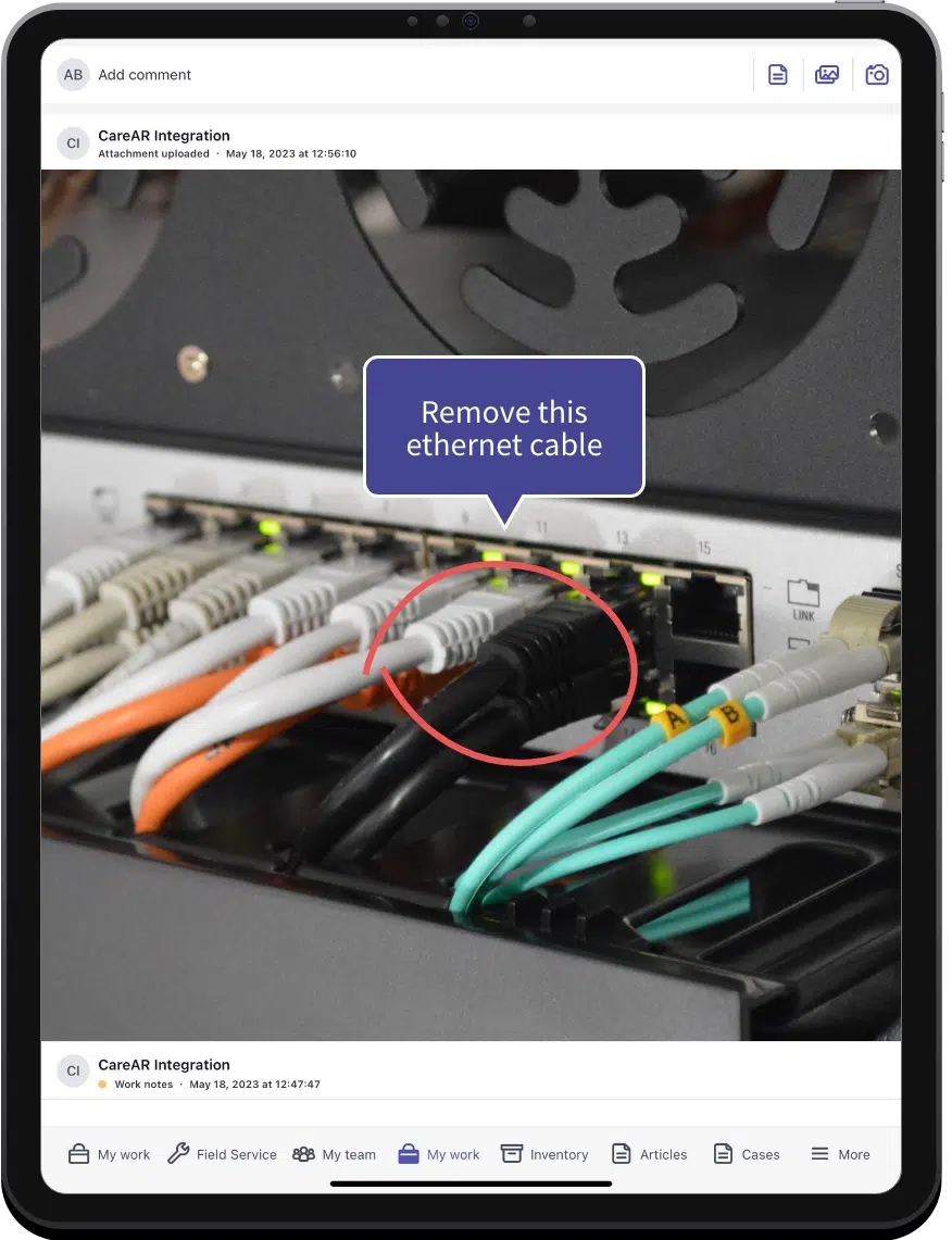 Escalate from Salesforce Service Cloud cases to CareAR Assist sessions with the click of a button and receive images, data, and video recordings.